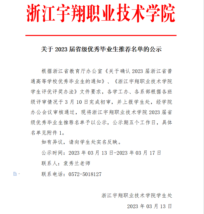 关于2023届省级优秀毕业生推荐名单的公示