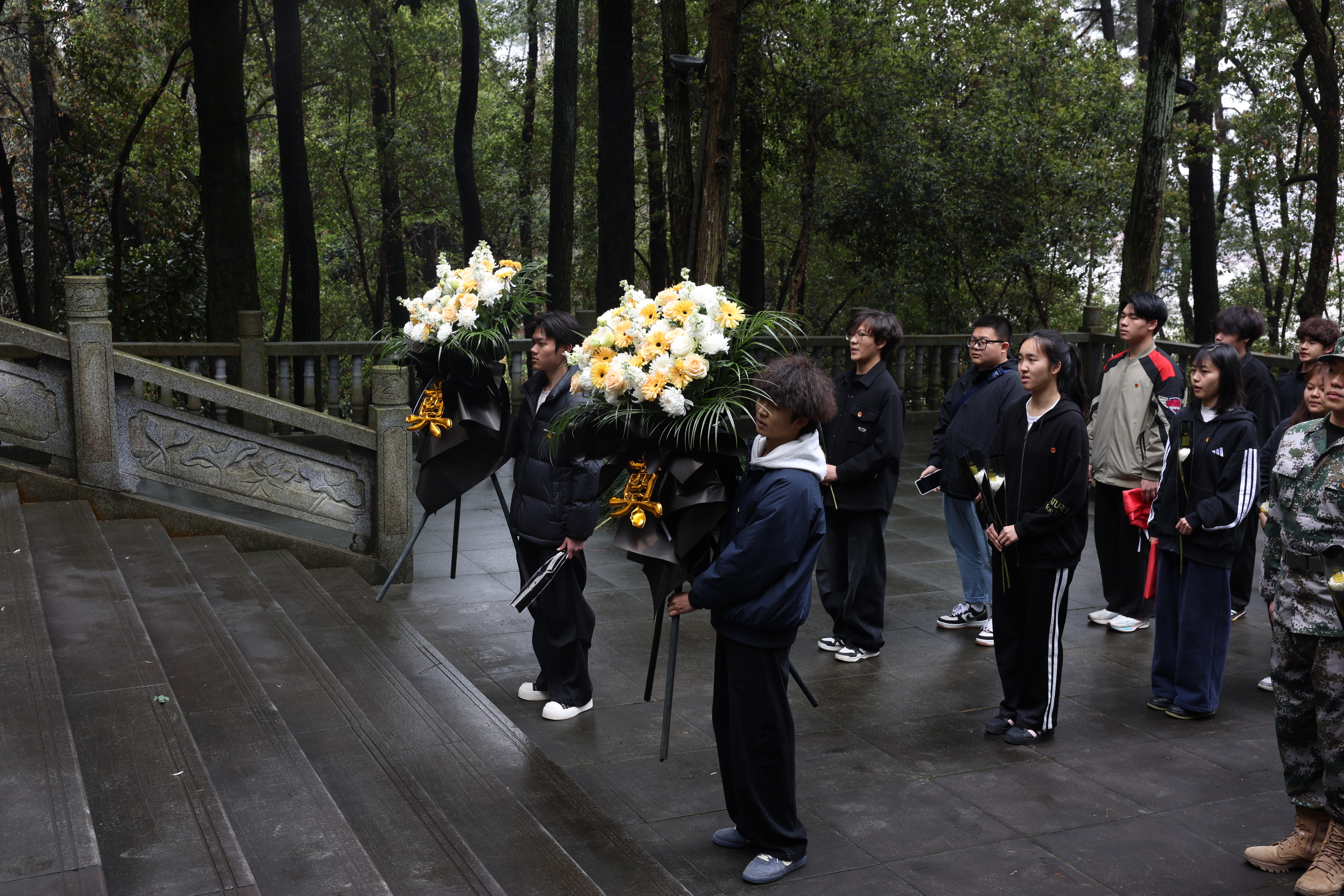 仪式初章,同学代表抬着花篮缓步上前,敬献于纪念碑前。随后,全场默哀一分钟,天地间仿佛只剩肃穆与追思,众人垂首肃立,回望先烈为民族解放、家国安宁抛头颅、洒热血的峥嵘岁月,寄去无尽缅怀与崇高敬意。